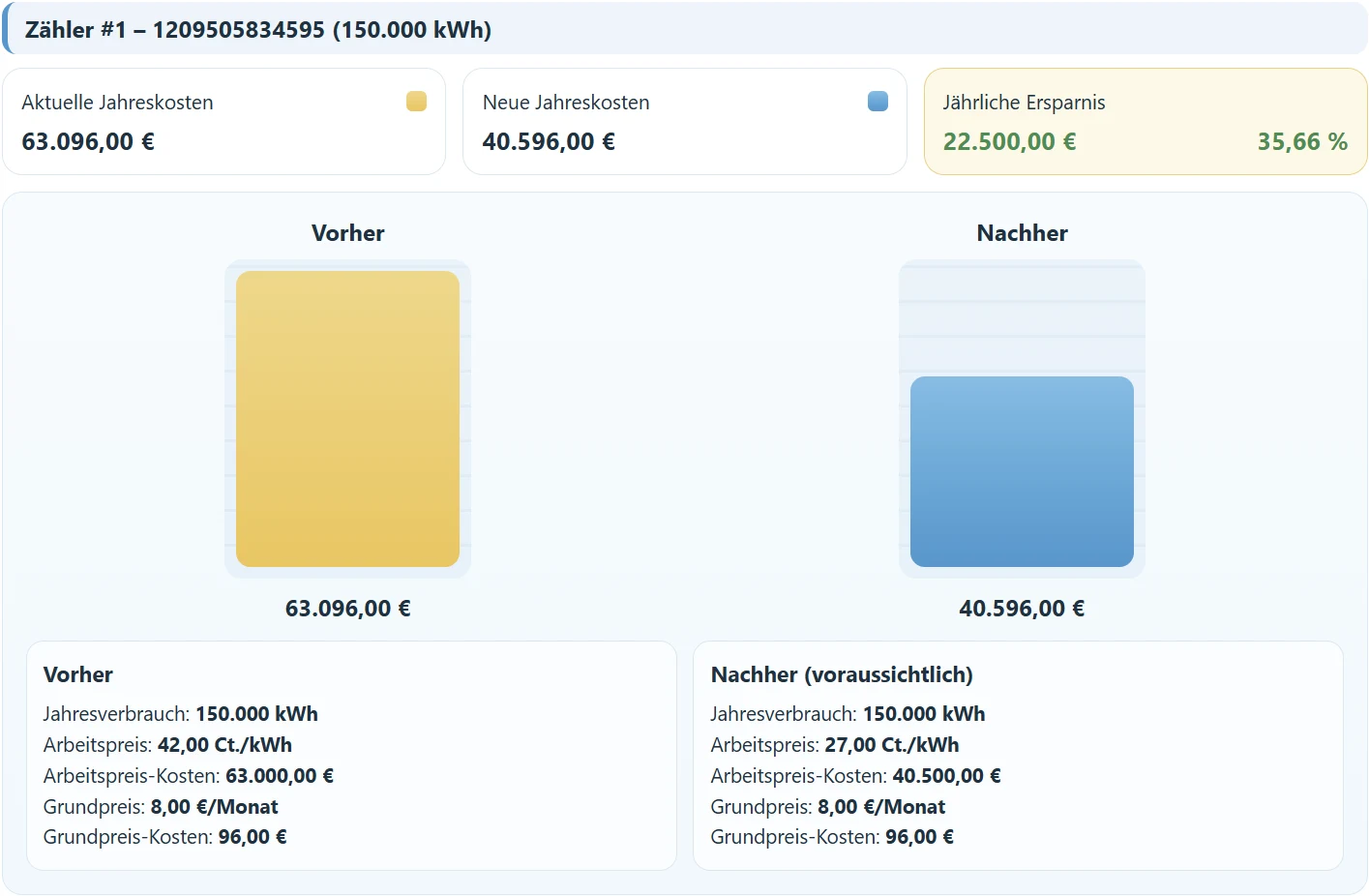 Kein kompliziertes Tool. Kein Excel-Chaos. Ein Dashboard, das Ihnen in Sekunden zeigt, was Ihr Strom kostet — und wo Sie handeln können.